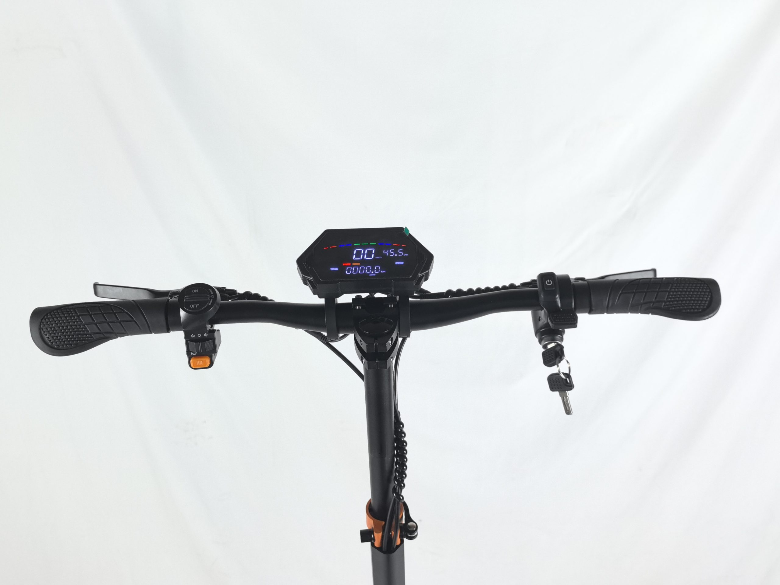 Пальцевый акселератор обеспечивает плавное и точное управление скоростью, позволяя без рывков трогаться с места и набирать нужный темп. Максимальная скорость составляет 40–45 км/ч, что оптимально для городских условий: вы не отстаёте от потока, но при этом сохраняете контроль над ситуацией. На руле установлена ЖК-панель, которая отображает текущую скорость, уровень заряда, пройденное расстояние и другие полезные параметры. Аккумулятор легко снимается, что удобно для зарядки в квартире или офисе, не занося весь самокат.